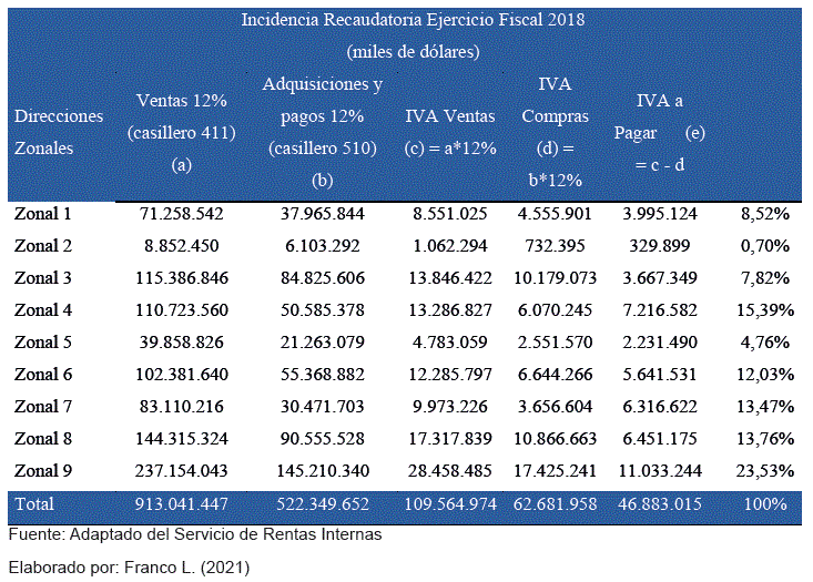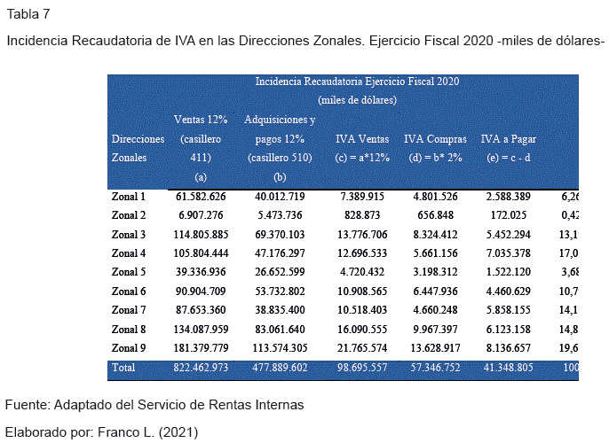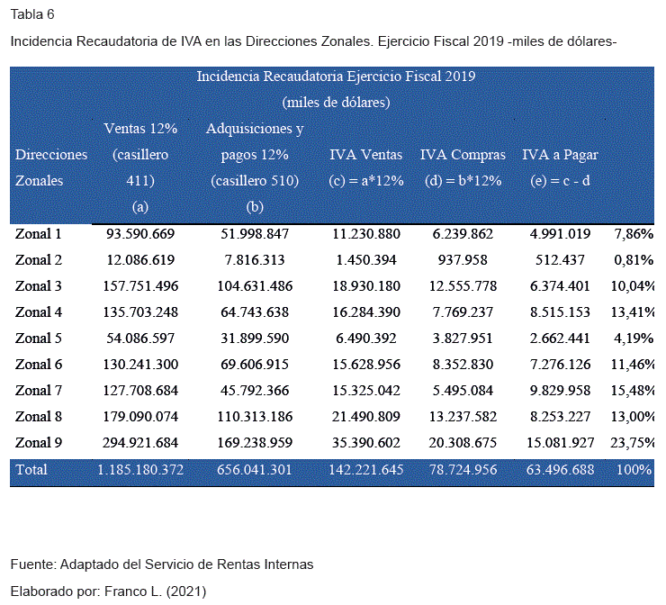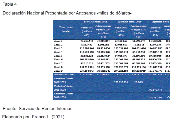 Cada una de las direcciones zonales en las que se encuentra dividido a nivel nacional el Servicio de Rentas Internas, la facturación de IVA de los artesanos no se refleja en la recaudación tributaria gestionada obtenida por ellas, debido a que al ser 0% no forma parte de las estadísticas de recaudación, por cuanto no existe un pago de este impuesto, pese a que los valores declarados por concepto de sus transferencias son representativos, con lo cual es evidente la incidencia del IVA para artesanos en estas jurisdicciones, aunque en mayor o menor magnitud dependiendo de la zona.
