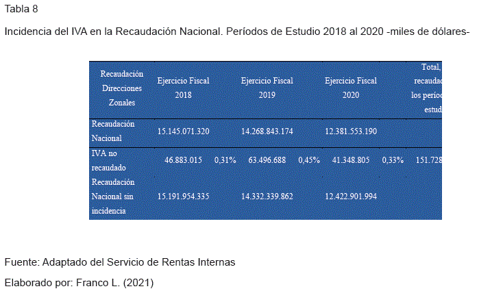 Esto permite cuantificar que la recaudación sin esta excepción de IVA a nivel nacional hubiera sido superior a la que se tuvo en los periodos fiscales de estudio, pudiendo ser USD 15.191 millones en el 2018, USD 14.332 millones en el 2019 y USD 12.422 millones en el 2020.