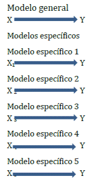 X = Competencias cognitivas, X1 = Memoria de hechos escolares, X2 = Autoconciencia de hechos escolares, X3 = Resolución de problemas escolares, X4 = Anticipación y planificación escolares, X5 = Capacidad lingüística, Y = Comprensión lectora