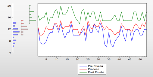 Los resultados obtenidos mediante STATA respecto a la media aritmética en la prueba de entrada son de Xe =10.3 y en la Prueba de Salida Xs=16.4, en términos estrictamente aritméticos. Y con datos no agrupados. Asimismo, en el Gráfico 1, se presenta, en comportamiento de los 53 niños, por logros de grafomotricidad en tres tiempos, pre prueba - proceso y post prueba. Y se puede declarar eficiente el programa por la línea verde respecto al punto inicial.