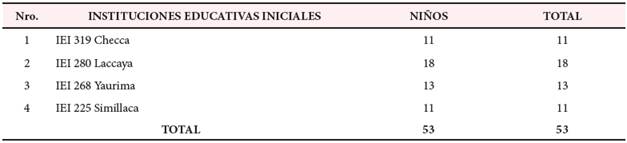 Tabla 1 Población de estudio según Instituciones Educativas Iniciales en provincia el Collao y Departamento de Puno (Perú).