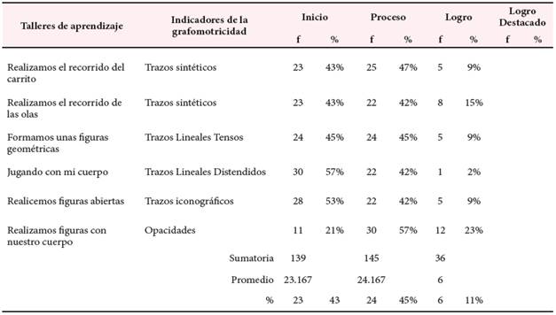 Realizando el análisis estadístico, se determinó la sumatoria, la media aritmética de los niveles de grafomotricidad, mediante la prueba de t test de medias comparadas. (Tabla 2) indica que tiene un valor aritmético de Xe =10.3, y en términos literales se encuentran en el nivel de inicio, con el 43%y proceso con el 45% respectivamente.