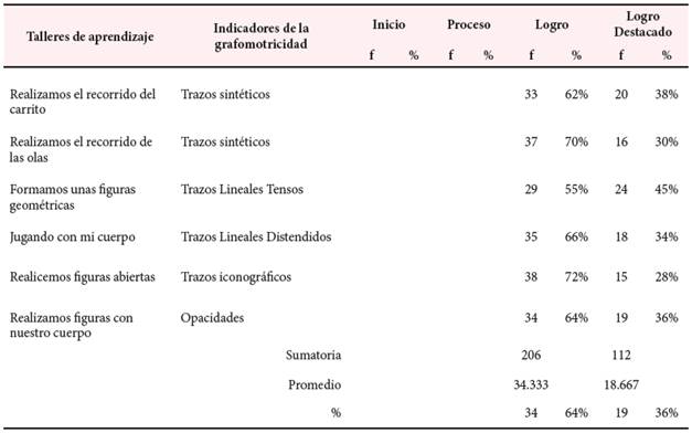 El resultado obtenido es de 10.3, el mismo indica que los niños de educación inicial antes del tratamiento experimental de los talleres de aprendizaje se encuentran mayoritariamente en la Escala Inicio y Proceso, respecto al desarrollo de competencias grafomotoras. Implicó que los niños objetos de estudio presentaron dificultades al realizar trazos sincréticos, trazos lineales tensos, trazos lineales distendidos, trazos iconográficos y opacidades. Es evidente, que no ha desarrollado competencias motrices y no son las más adecuadas, en la relación a la edad que pertenecen los niños.