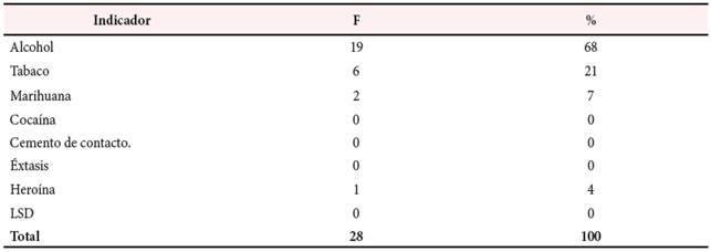 Con respecto a la sustancia de mayor consumo, los encuestados señalaron en primer lugar el consumo de alcohol, 68 %; seguido por el tabaco 21 %; marihuana 7 %, heroína 4 % respectivamente. (Tabla 1).