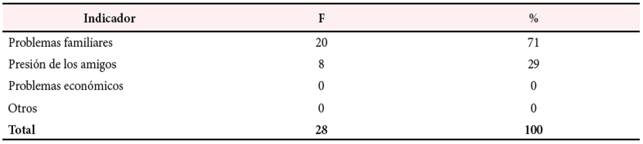 Con respecto a los motivos de consumo de alcohol y drogas; el 71 % de investigados manifestó que es por motivos familiares; seguido por 29 %, que expresaron presión de los amigos. (Tabla 2).