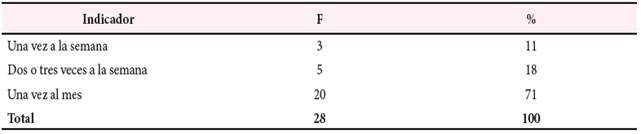 Los investigados sobre la frecuencia del consumo de alcohol señalaron una vez a la semana el 11 %; el 18 % dos o tres veces a la semana; y, el 71 % una vez al mes. (Tabla 3).