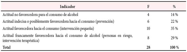 La Tabla 4 indica las actitudes de los investigados hacia el consumo de alcohol; el 14 % indican una actitud no favorecedora para el consumo de alcohol; el 22 % una actitud indecisa o posiblemente favorecedora hacia el consumo (prevención); el 35 % actitud favorecedora hacia el consumo (intervención pequeña); y, el 29 % una actitud francamente favorecedora hacia el consumo de alcohol (personas en riesgo, intervención terapéutica). Al agrupar los porcentajes más altos, se obtuvo que un 64 % de actitudes favorecedoras al consumo de alcohol en los estudiantes.