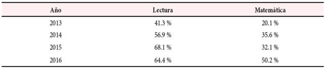 Tabla 1 Distribución del nivel satisfactorio para logros de aprendizaje en lectura y matemática.