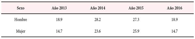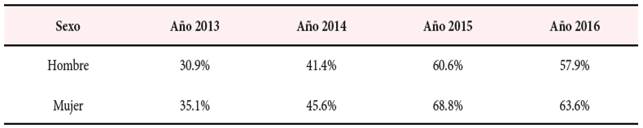 Se observa que en el 2013 se reportó una diferencia de 4.2%, en el 2014 fue de 4.6%, disminuyendo en el 2015 cuando la diferencia fue de 1.4% y en el 2016 los resultados se diferencian a 4.2%, confirmando que si existió diferencia en el nivel satisfactorio para logros de aprendizaje en matemática según sexo (Tabla 3).