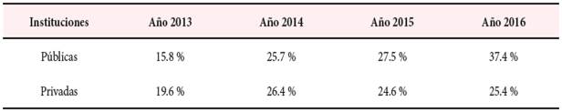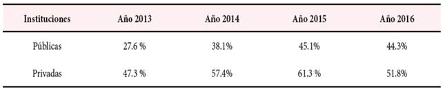 Se observa una diferencia en el 2013 para lectura de 19.7% a favor de las IE privadas, en el 2014 casi se mantuvo la diferencia en 19.3%. En el 2015 se presentó una mejora en las IE públicas y la diferencia fue de 16.2% a favor de las IE privadas. Para el año 2016 la diferencia de 7.5% se mostró también significativa (Tabla 4).