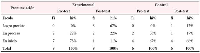 De acuerdo a la Tabla 2, se describe los resultados de la prueba de entrada (Pre test) de los niños del grupo experimental y de control en cuanto a pronunciación. En la escala logro previsto, tanto en el grupo experimental como de control no se ubica ningún niño (0%). En la escala en proceso, en el grupo experimental se ubican dos niños (22%) y en el grupo control se ubican dos niños (33%). En la escala en inicio, en el grupo experimental siete niños (78%), mientras que en el grupo de control cuatro niños (67%). También se muestra en los resultados que en la prueba de salida (Pos test) de los niños del grupo experimental y de control en cuanto a pronunciación se observa que en la escala logro previsto del grupo experimental se ubican seis niños (67%) y en el grupo control un niño (17%). En la escala en proceso, en el grupo experimental se ubican dos niños (22%) y en el grupo control se ubica un niño (17%) en inicio, en el grupo experimental existe un niño (11%), mientras que en el grupo de control se ubican cuatro niños (66%).Estos resultados significan que en la mayoría del grupo experimental (67%), se ubicaron en logro previsto, de esa manera el experimento aplicado dio resultados positivos.