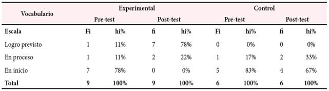 De acuerdo a la Tabla 3, los resultados de la prueba de entrada (Pre test) de los niños del grupo experimental y de control en cuanto a vocabulario. En la escala logro previsto, en el grupo experimental se ubica un niño que representa el (11%) y en el grupo control no se ubica ningún niño (0%). En la escala en inicio, en el grupo experimental se ubica un niño (11%), en el grupo control se ubica un niño (17%). En la escala en inicio, en el grupo experimental existen siete niños (78%), mientras que en el grupo de control se ubican cinco niños (83%). También se muestra en los resultados de la prueba de salida (Pos test) de los estudiantes del grupo experimental y de control en cuanto a vocabulario se observó que en la escala logro previsto, en el grupo experimental se ubican siete niños (78%) y en el grupo control no se ubica ningún estudiante (0%). En la escala en proceso, en el grupo experimental se ubican dos niños (22%) y en el grupo control se ubica dos niños (33%). En la escala en inicio, en el grupo experimental no existe ningún estudiante (0%), mientras que en el grupo de control se ubican cuatro niños (67%). Estos resultados significan que en la mayoría de niños del grupo experimental (78%), se encuentran en logro previsto, de esa manera el experimento aplicado dio resultados positivos.