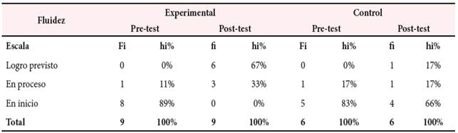 En la Tabla 4, los resultados de la prueba de entrada (Pres test) de los niños del grupo experimental y de control en cuanto a fluidez. En la escala de logro previsto, tanto en el grupo experimental como en el grupo control no se ubica ningún niño (0%). En la escala en proceso, en el grupo experimental se ubica un niño (11%) y en el grupo control se ubica un niño (17%). En la escala en inicio, en el grupo experimental existen ocho niños (89%), mientras que en el grupo control se ubican cinco niños (83%). También se muestra en los resultados de la prueba de salida (Pos test) de los niños del grupo experimental y de control en cuanto a fluidez se observó en la escala logro previsto, en el grupo experimental se ubican seis niños (67%) y en el grupo control se ubica un niño (17%). En la escala en proceso, en el grupo experimental se ubican tres niños (33%) y en el grupo control se ubica un niño (17%). En la escala en inicio, en el grupo experimental no existe ningún estudiante (0%), mientras que en el grupo de control se ubican cuatro niños (66%). Estos resultados significan que en la mayoría de los niños del grupo experimental (67%), se ubicaron en logro previsto, de esa manera el experimento aplicado dio resultados positivos. Para ello, se desarrolló talleres para que no haya una perdida lingüística, y sea posible brindar una enseñanza en castellano como la lengua uno (L1), que vendría a ser la L1 de los niños, y luego incluir la lengua quechua que será la lengua dos (L2). (Galdames y Walqui, 2006).