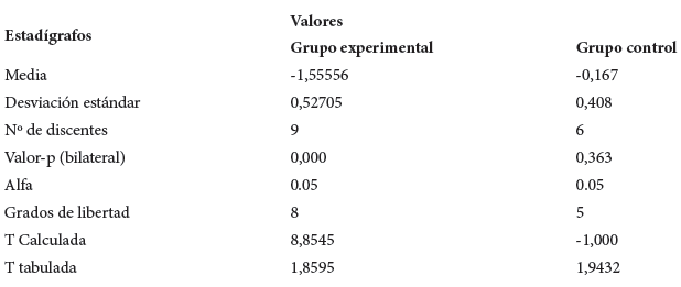 El valor calculado para el grupo experimental es 8,8545 por lo tanto se contrasta contra el valor tabular que para 9 grados de libertad es de 1,8595.