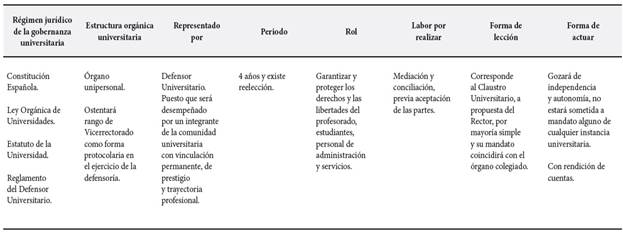 Tomando en consideración el procedimiento interno que de acuerdo a la ley le dan las universidades, se ha tomado como referencia los Estatutos de la Universidad de Málaga, institución pública universitaria ubicada en la ciudad de Andalucía, que fuera aprobado mediante Decreto 464/2019 del 14 de mayo de 2019 (BOJA, 2019), en el cual se establece los mecanismos de regulación y funcionamiento de la Defensoría, considerado como un órgano unipersonal de garantía y control, en el cual se determina: