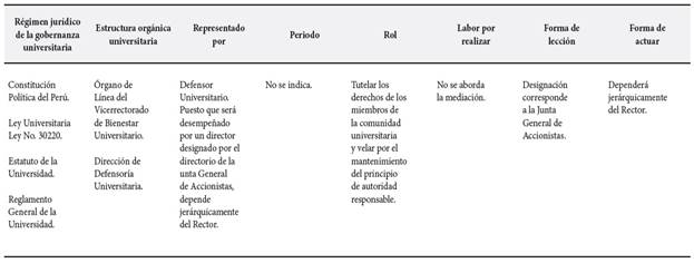 En la Universidad de Málaga, tiene la labor de mediar y conciliar, previa aceptación de las partes; en la Universidad César Vallejo, no se aborda la mediación; en la Universidad de Guayaquil, existe mediación como función reglamentada.