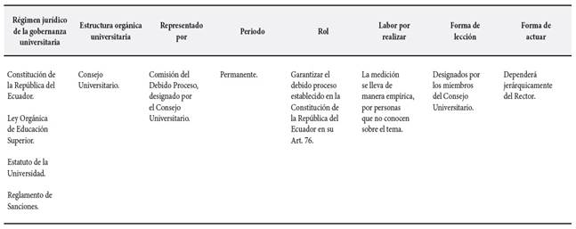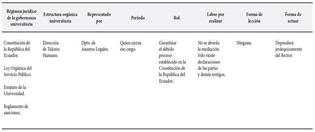 De lo que se puede colegir, que en ninguno de los tres casos existe la figura del Defensor Universitario que permita la mediación y conciliación, frente a los problemas que pudieran existir dentro de la comunidad universitaria. Lo que sí existe, que para la defensa de los actores inmersos en el conflicto deberán recurrir a la Comisión del Debido Proceso, que es designado por la autoridad nominadora de la institución, en los casos de los profesores, estudiantes y autoridades que sean denunciadas, mas no de los servidores administrativos y de servicios. (Tabla 3).