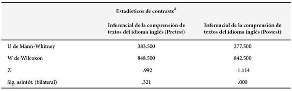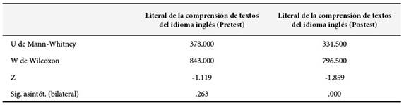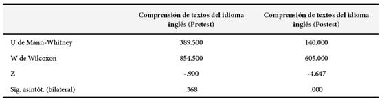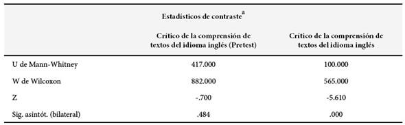Los resultados del pretest, muestran los estadísticos obtenidos para los grupos de estudio, donde el nivel de significancia p = 0.484 mayor que p = 0,05 (p > 𝛼) y z = -.700 mayor que -1,96 (punto crítico), el cual denota que, al inicio, los estudiantes presentan resultados similares respecto al nivel crítico de la comprensión de textos del idioma inglés, es decir, el grupo control y experimental no presentan diferencias significativas.