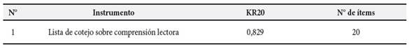 El instrumento utilizado fue una lista de cotejo sobre comprensión lectora, la cual tuvo como objetivo medir el nivel de comprensión lectora de los estudiantes de primer año de secundaria, elaborada por Olano (2003) y adaptada por Chávez (2021), comprendida por dos dimensiones: etapas de la lectura y procesos psicológicos de la lectura, su aplicación fue individual y mediante el WhatsApp, con un tiempo de duración de 20 minutos. La confiabilidad del instrumento, se realizó a través de una prueba piloto aplicada a 15 estudiantes, mediante el KR20 para la lista de cotejo sobre comprensión lectora, y procesado en el software estadístico Excel (Tabla 1).