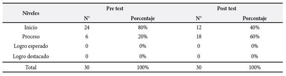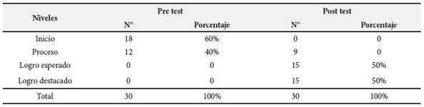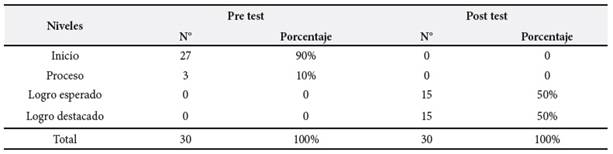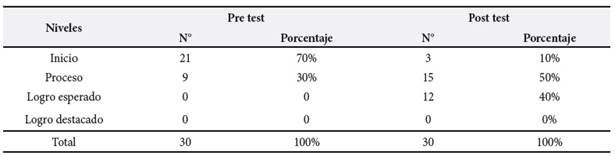 Tabla 3 Distribución de frecuencias de los niveles de la comprensión lectora del grupo experimental, según pretest y pos-test.
