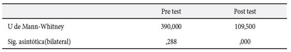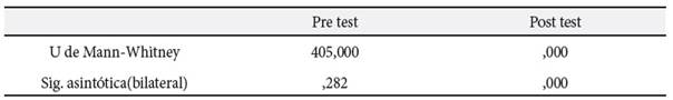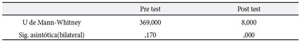 En las Tablas 6 y 7 se puede observar que, la comprensión lectora en los estudiantes de primer año de educación secundaria del grupo control y experimental según pre test presentan condiciones similares (U-Mann-Whitney: p= 0,282), y, asimismo, los puntajes de los estudiantes del grupo experimental según post test presentan diferencias significativas con los puntajes obtenidos (U-Mann-Whitney: p= 0,000) y permite determinar el rechazo de la H0. En consecuencia, la estrategia de inferencia influye significativamente para mejorar la comprensión lectora de los estudiantes del primer año de educación secundaria de la I.E. No 2032 “Manuel Scorza Torres” del distrito de San Martín de Porres, Lima, 2020.