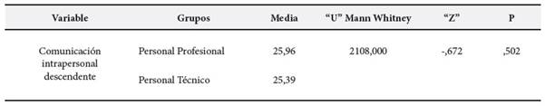 Los resultados obtenidos como promedio de la comunicación interpersonal en trabajadores profesionales y técnicos fueron de 25,96 y 25,39 respectivamente, notándose que los trabajadores profesionales poseen una mayor; sin embargo en la prueba “U” de Mann Whitney, se comprueba que estas diferencias no son significativas (p > ,05); por lo tanto, se acepta la hipótesis nula, es decir, no existe diferencias en la percepción comunicación intrapersonal entre trabajadores profesionales y técnicos de la Oficina de Recursos Humanos del Ministerio de Educación en Perú (Tabla 1).