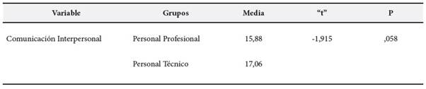 Se obtuvieron resultados de 15,88 y 17,06 al comparar los promedios de comunicación interpersonal en los trabajadores profesionales y técnicos respectivamente, apreciando una mayor media en trabajadores técnicos; sin embargo, al emplear la prueba “t” de Student, se determinó que estas diferencias no son significativas (p > ,05); es por esto que se acepta la hipótesis nula, no existe diferencias en la percepción comunicación interpersonal entre trabajadores profesionales y trabajadores técnicos de la Oficina de Recursos Humanos del Ministerio de Educación en Perú (Tabla 2).