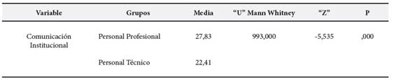 Los resultados respecto a la comunicación institucional presente en la Tabla 3, muestran una mayor media en los trabajadores profesionales (27,83) a diferencia de los técnicos (22,41); asimismo, tras realizar prueba “U” de Mann Whitney, se rechaza la hipótesis nula, ya que la diferencia fue significativa (p < ,05); por lo que se concluye que respecto a la percepción en la comunicación institucional entre trabajadores profesionales y técnicos existe diferencias.