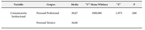 La comunicación institucional, presentó una media de 27,83 y 22,41 para los trabajadores profesionales y técnicos respectivamente, además de acuerdo a la prueba “U” de Mann Whitney, si existe una diferencia significativa (p < ,05); en la percepción de la comunicación institucional entre ambos grupos de trabajadores, estos resultados son reforzados por el estudio realizado por Charry (2018), quién demostró que existe una correlación significativa entre la comunicación interna y las dimensiones grado de estructura y su influencia en el cargo ocupado por el trabajador; además demostró que existe una correlación significativa positiva y muy fuerte (r = 0.959) entre la comunicación interna y el clima de la organización. Asimismo, Monteiro et al. (2021), afirma que el proceso de comunicación organizacional interna está determinada por sus factores, los cuales deben ser brindados y reforzados por la organización, como, por ejemplo, garantizar el acceso y disponibilidad de las herramientas de comunicación interna.