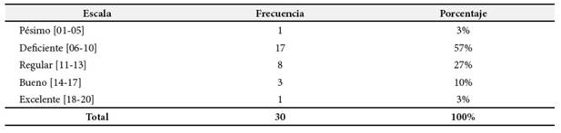 Los resultados de la prueba de entrada muestran que un estudiante que representa el 3% de la población se ubicó en la escala de pésimo, 17 estudiantes que representan el 57% de la población se ubicaron en la escala deficiente, así mismo se obtuvo que 8 estudiantes que representan el 27% de la población alcanzó la escala regular, también se tiene 3 estudiantes que representan el 10% en la escala de bueno, mientras que en la escala de excelente se halló un estudiante. De estos resultados se puede afirmar que los estudiantes de la carrera profesional de Administración de Recursos Agropecuarios y Forestales se encuentran en su mayoría en un nivel de logro de aprendizajes en la escala de deficiente (Tabla 1).
