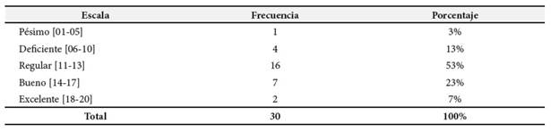Los resultados de la prueba de salida muestran que un estudiante que representa el 3% de la población en la escala de pésimo, así también se tiene 4 estudiantes que representan el 13% de la población se ubicaron en la escala deficiente, mientras que 16 estudiantes que representan el 53% de la población se ubicaron en la escala regular, por otro lado se tiene 7 estudiantes que representan el 23% de la población alcanzaron la escala de bueno y 2 estudiantes que representan el 7% de la población alcanzaron la escala excelente. De estos resultados se afirma que después de la aplicación del experimento la mayoría de los estudiantes alcanzaron un nivel de logro de aprendizaje de regular a bueno (Tabla 2).