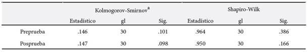 La prueba de normalidad Shapiro-Wilk para la prueba de entrada indica un valor de 0.964 con un p valor de 0.386 el cual es mayor al propuesto (p>0.05), por lo tanto, se asume que la distribución de datos es normal. Para la prueba de salida se obtuvo un valor estadístico de Shapiro-Wilk de 0.950 con un p valor de 0.166 que es mayor al propuesto (p>0.05) por lo tanto se asume que la distribución de los datos de la prueba de salida es normal. En consecuencia, se opta por la aplicación de la prueba estadística T para muestras relacionadas (Tabla 3).