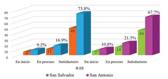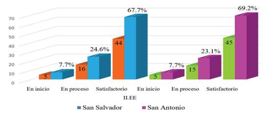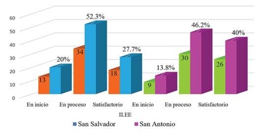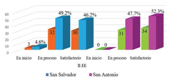 Los resultados del presente acápite corresponden a la estadística descriptiva, la misma que ha permitido responder los objetivos planteados. En la Figura 1 se describe la diferencia estadística de la variable comprensión de textos escritos entre los estudiantes de una institución parroquial y nacional, en ese sentido se puede notar que los estudiantes San Salvador-Parroquial oscila entre las puntuaciones en nivel proceso (32 = 49.2%) y satisfactorio (30 = 46.2%) mientras que los estudiantes de San Antonio-Nacional oscilan entre las puntuaciones en el nivel en proceso (31 = 47.7%) y satisfactorio (34 = 52.3%). En conclusión, los estudiantes se encuentran en similares condiciones en lo que refiere a los niveles de comprensión de textos escritos entre los estudiantes de ambas instituciones.