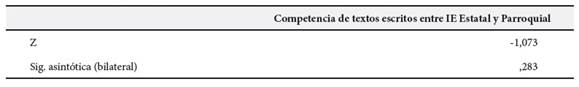 En la Tabla 1, según la prueba de rangos con signo de Wilcoxon, se observa que el valor de Z = -1,073 y la significancia asintótica (bilateral) es (0.283 > 0.05), en referencia a los resultados se acepta la hipótesis nula y se concluye estadísticamente que no existen diferencias significativas en la comprensión de textos escritos en estudiantes de quinto grado de Educación Básica Regular de una institución parroquial y estatal de la ciudad de Lima durante el año 2019.