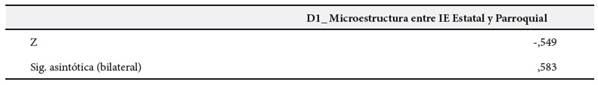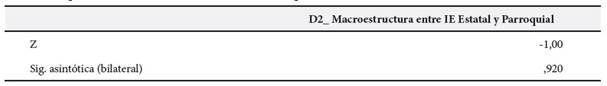 En la Tabla 2, según la prueba de rangos con signo de Wilcoxon, se observa que el valor de Z = -0,549 y la significancia asintótica (bilateral) es (0,583 > 0,05), en referencia a los resultados se acepta la hipótesis nula y se concluye estadísticamente que no existen diferencias significativas en la dimensión microestructura de comprensión de textos escritos en estudiantes de quinto grado de Educación Básica Regular de una institución parroquial y estatal de la ciudad de Lima durante el año 2019.