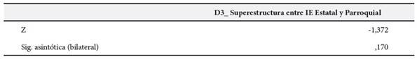En la Tabla 3, según la prueba de rangos con signo de Wilcoxon, se observa que el valor de Z = -1,372 y la significancia asintótica (bilateral) es (0,170 > 0,05), en referencia a los resultados se acepta la hipótesis nula y se concluye estadísticamente que no existen diferencias significativas en la dimensión superestructura de comprensión de textos escritos en estudiantes de quinto grado de Educación Básica Regular de una institución parroquial y estatal de la ciudad de Lima durante el año 2019.