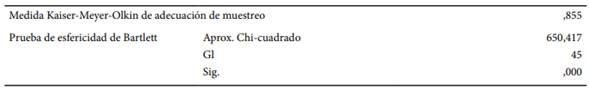 Los reportes estadísticos que se muestran en la Tabla 1 sustentan un valor de Kaiser-Meyer-Olkin de 0,855, en la prueba de esfericidad de Bartlett se obtuvo un P valor de 0,000; de esta manera, se evidencian indicadores adecuados para el procesamiento estadístico.