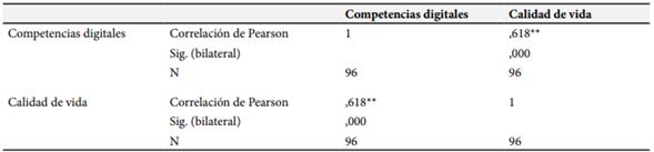 La Tabla 3 muestra las competencias digitales se relacionan de manera directa y significativa, directa por ser positiva con un indicador de 0,618 y significativa porque la significancia está por debajo del 0,05. Así también se muestra que todos los datos fueron procesados; es decir, no hubo datos vacíos en la información recabada. Bajo estos resultados se especifica que a medida que las competencias digitales se incrementan, la calidad de vida también va en aumento; por lo tanto, queda claro que una acción pendiente de reforzar por las instituciones educativas en promover las capacitaciones en los entornos digitales, apoyando de esta manera a que el personal docente pueda tener una mejor calidad de vida.