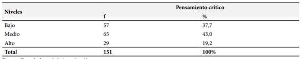 Los hallazgos revelaron que el 37,7% de los estudiantes tuvo un nivel bajo, el 43% evidenció un nivel medio y el 19,2% tuvo un nivel elevado en pensamiento crítico, lo cual indica que una proporción significativa clasificó en un nivel medio y otro tanto en el nivel alto, lo cual demostraría que es posible lograr el desarrollo del pensamiento crítico desde el aula, siempre que se planifiquen actividades pedagógicas encaminadas a lograr este fin.