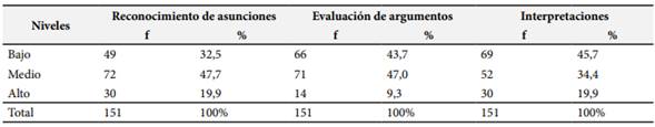 La Tabla 1 muestra que el 37,7% de los estudiantes se encuentran en el nivel bajo de pensamiento crítico, el 43% se encuentran en el nivel medio, en tanto que 19,2% se encuentra en el nivel alto.