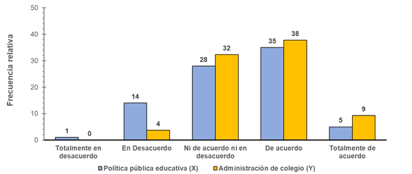 Figura 1. Distribución relativa de las frecuencias relativas de los niveles de respuestas para las variables política pública educativa y administración de colegios.
