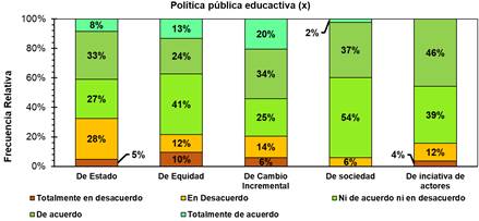 Figura 2. Distribución de las frecuencias relativas para los niveles de respuesta de las dimensiones de la política pública educativa.