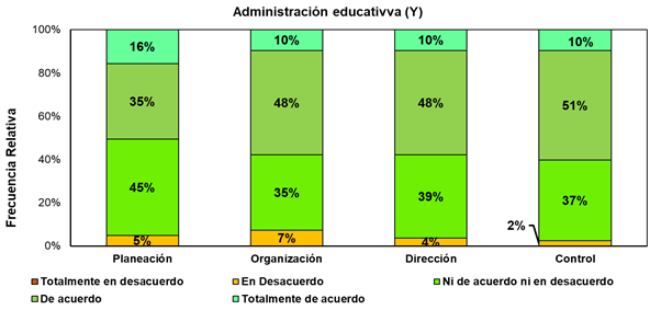 En lo que respecta a la AE, se observa una percepción favorable en cuanto a la gestión administrativa de los centros educativos. Esto se evidencia en una mayor proporción de respuestas que se sitúan en los niveles De acuerdo y Totalmente de acuerdo, especialmente en las dimensiones de planeación, organización, dirección y control. Estos resultados indican que los participantes tienen una visión positiva y favorable acerca de cómo se lleva a cabo la gestión administrativa en los centros educativos, implicando que existe una percepción de que se planifican adecuadamente las acciones, se organiza eficientemente el funcionamiento de los centros, se lleva a cabo una dirección efectiva y se realiza un control adecuado para asegurar el cumplimiento de los objetivos establecidos.