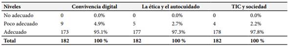 Estos resultados sugieren que la mayoría de los estudiantes tienen un buen manejo de la convivencia digital, la ética en el uso de las TIC y su integración en la sociedad. Esto es crucial en un contexto educativo donde la virtualidad ha cobrado gran relevancia, especialmente durante la pandemia de COVID-19. Estos hallazgos también pueden indicar que las políticas educativas y las estrategias de enseñanza durante la pandemia pueden haber contribuido positivamente al desarrollo de habilidades digitales y éticas entre los estudiantes. Sin embargo, es importante continuar monitoreando y fortaleciendo estas habilidades para garantizar un uso responsable y efectivo de las tecnologías digitales en el ámbito educativo y social.