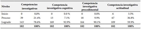 Basado en los resultados de la Tabla 2 sobre las competencias investigativas de los estudiantes. En general, el 78.6% de los estudiantes se ubicaron en el nivel logrado en competencias investigativas, lo cual indica que la mayoría ha alcanzado un nivel satisfactorio en el desarrollo de estas habilidades. Esto sugiere que existe una base sólida de competencias investigativas entre los participantes del estudio. Al analizar las dimensiones específicas de las competencias investigativas, se pudo encontrar que, en la competencia cognitiva, un impresionante 92.9% de los estudiantes están ubicados en el nivel logrado, lo que señala una fuerte capacidad para el pensamiento crítico, la comprensión y el análisis en el contexto de la investigación. En cuanto a la competencia investigativa procedimental, el 90.1% se sitúa en el nivel logrado, indicando que la mayoría de los estudiantes poseen habilidades adecuadas para llevar a cabo metodologías y procedimientos de investigación de manera efectiva y organizada.