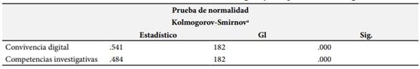 En la Tabla 3 la prueba de Kolmogorov-Smirnov fueron aplicadas en los dos variables, convivencia digital y competencia investigativas donde se obtuvo ,000 de significancia lo que indica que es menor a ,005 demostrando seguir una distribución no normal; en consecuencia, demuestra que es no paramétrica y conllevando aplicar la regresión logística ordinal. El resultado de la prueba de Kolmogorov-Smirnov con un valor de significancia de 0.000 para ambas variables, convivencia digital y competencias investigativas, indica que estas variables no siguen una distribución normal. Dado que el valor de significancia es menor que 0.005, se confirma que la distribución de los datos es no paramétrica.