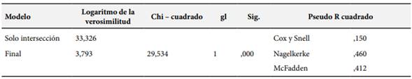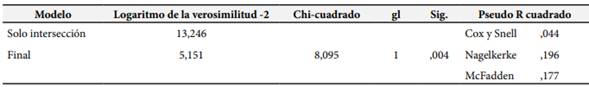 Tabla 4. Ajuste del modelo y Pseudo R2 que explica la influencia de la convivencia digital para desarrollar las competencias investigativas en tiempos de pandemia.