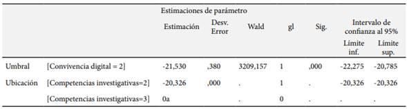 En la Tabla 5, se observó que la variable convivencia digital mostró una respuesta significativa en la predicción de las competencias investigativas. El valor del parámetro de Wald fue de 3209.157, con un nivel de significancia de 0.000, inferior al α de 0.05 establecido. Esto indicó que había una relación estadísticamente significativa entre la convivencia digital adecuada y el desarrollo positivo de las competencias investigativas entre los estudiantes analizados. Los resultados destacaron que un entorno digital positivo y educativo influyó de manera significativa en la mejora de las habilidades investigativas de los estudiantes. En consecuencia, se concluyó que la convivencia digital adecuada contribuyó positivamente al desarrollo de competencias investigativas, subrayando la importancia de crear y mantener ambientes digitales que fomenten el aprendizaje activo y crítico entre los estudiantes.
