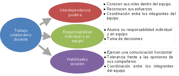 Bajo esta afirmación, López y Molina (2018); Aparicio et al., (2021); Paravic y Lagos (2022) agregan que el trabajo colaborativo docente es una estrategia efectiva dentro de la institución, involucra y fortalece en la formación continua y profesional de los docentes mejoran su desempeño pedagógico y la gestión de equipos de trabajo; señalan como elementos en común la generación de confianza entre sus integrantes, responsabilidad individual y en equipo, liderazgo compartido en servicio, monitoreo mutuo de tareas, apoyo en las tareas o actividades, comunicación e interacción entre los integrantes, adaptación a las circunstancias del contexto y definición como equipo. Entonces, la responsabilidad individual y en equipo en el trabajo colaborativo docente lleva al crecimiento profesional e instaura cultura organizacional en la institución.
