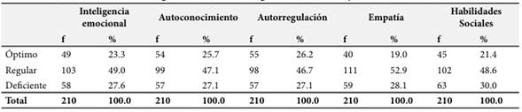 Continuando con el análisis de los resultados presentados en la Tabla 2, se observa que la inteligencia emocional en la mayoría de los estudiantes se ubicó en un nivel regular, representando un 49.0% de la muestra total. Este hallazgo es consistente con la percepción de las distintas dimensiones que conforman la inteligencia emocional. Específicamente, el autoconocimiento se situó en un nivel regular en un 47.1% de los estudiantes, la autorregulación en un 46.7%, la empatía en un 52.9% y las habilidades sociales en un 48.6%. Además, los niveles óptimos de inteligencia emocional y sus dimensiones fueron menos frecuentes, con un 23.3% para la inteligencia emocional general, y variando entre el 19.0% y el 26.2% para las dimensiones individuales. Esto indica que solo una minoría de los estudiantes muestra un desarrollo elevado en estas áreas clave. Por otro lado, un porcentaje considerable de estudiantes, en torno al 27%, presentó niveles deficientes en inteligencia emocional y sus dimensiones, lo que subraya la necesidad de intervenciones que fortalezcan estas competencias emocionales.